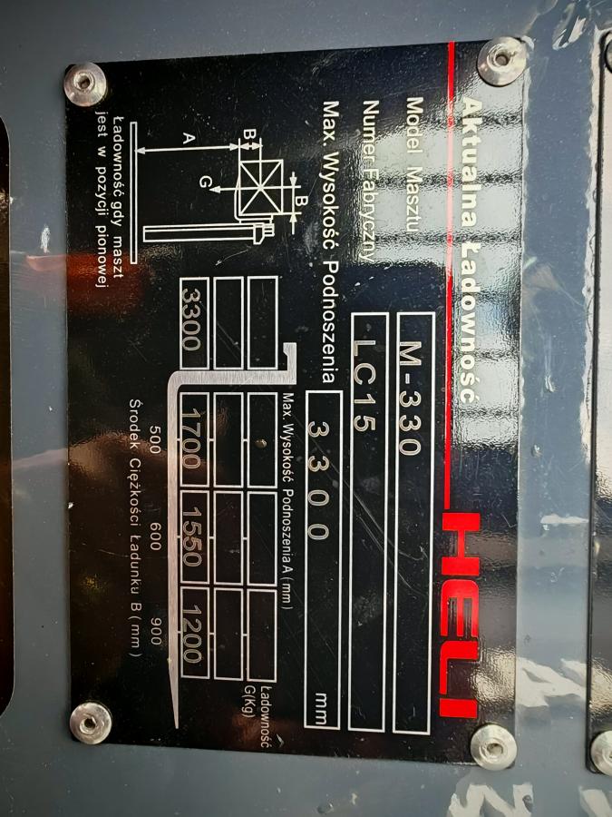 Wyposażenie: przesuw boczny wideł, opony pneumatyczne, oświetlenie robocze.